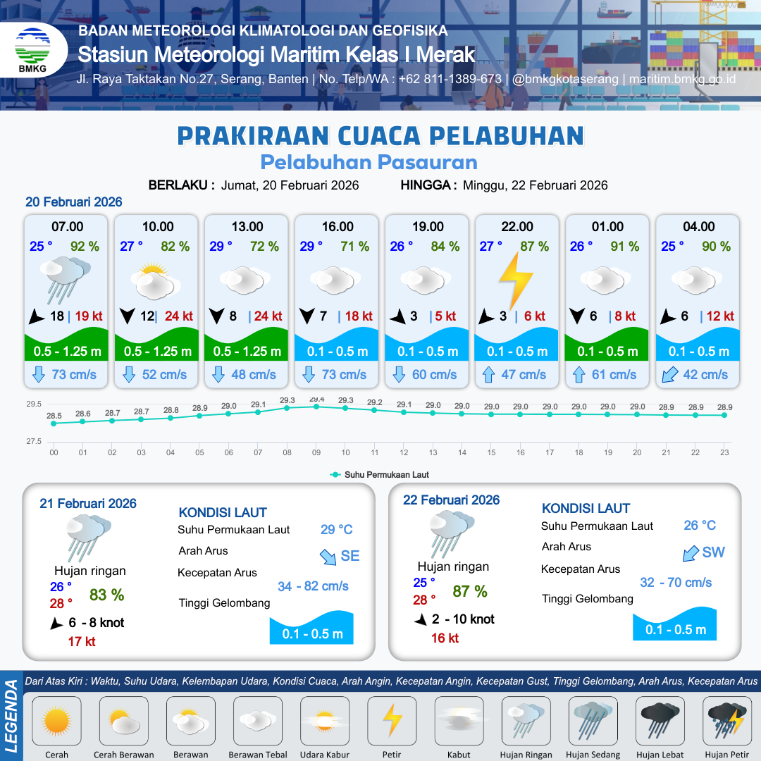 20 Feb 26, 23.00 5 jam kedepan | Berawan Tebal | Timur Laut 8 kt Gust Peningkatan kecepatan angin yang singkat dan tiba-tiba : 13 kt | | | 10 km | 25 °C | 90 % | +0.05 m |