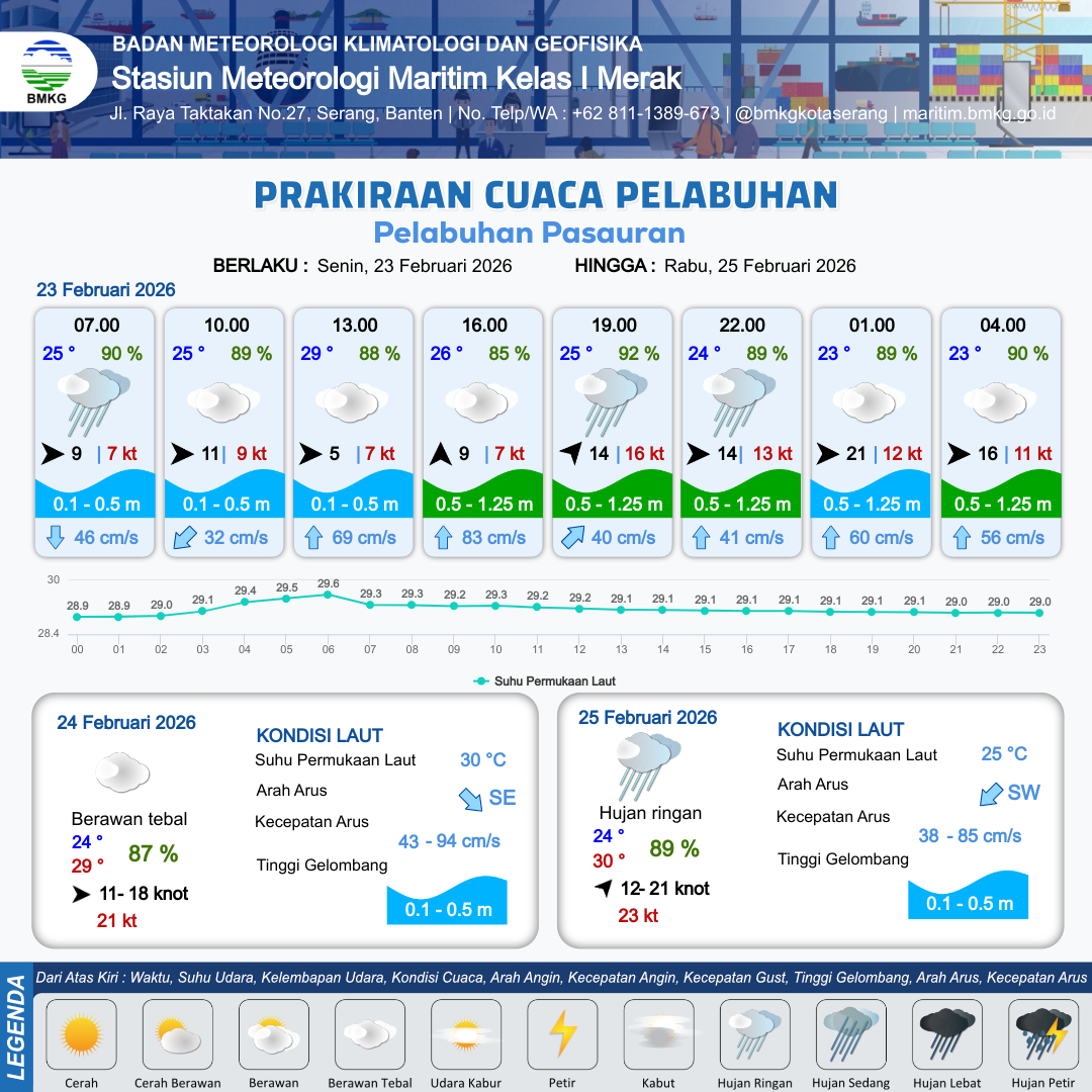23 Feb 26, 04.00 14 jam yang lalu | Berawan Tebal | Barat 11 kt Gust Peningkatan kecepatan angin yang singkat dan tiba-tiba : 9 kt | | | 10 km | 27 °C | 89 % | +0.51 m |