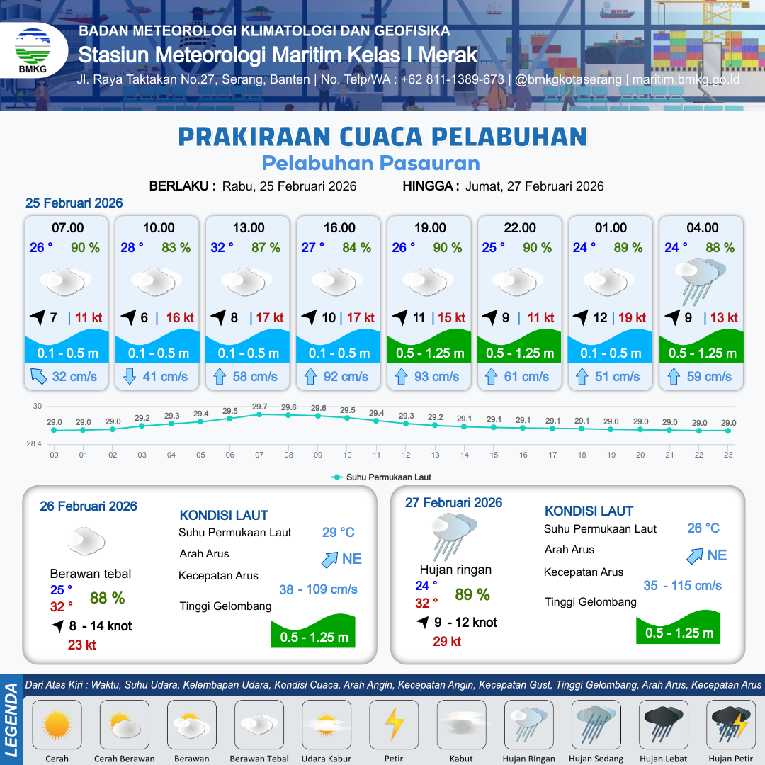 25 Feb 26, 08.00 9 jam yang lalu | Berawan Tebal | Barat Daya 10 kt Gust Peningkatan kecepatan angin yang singkat dan tiba-tiba : 18 kt | | | 10 km | 29 °C | 85 % | +0.23 m |