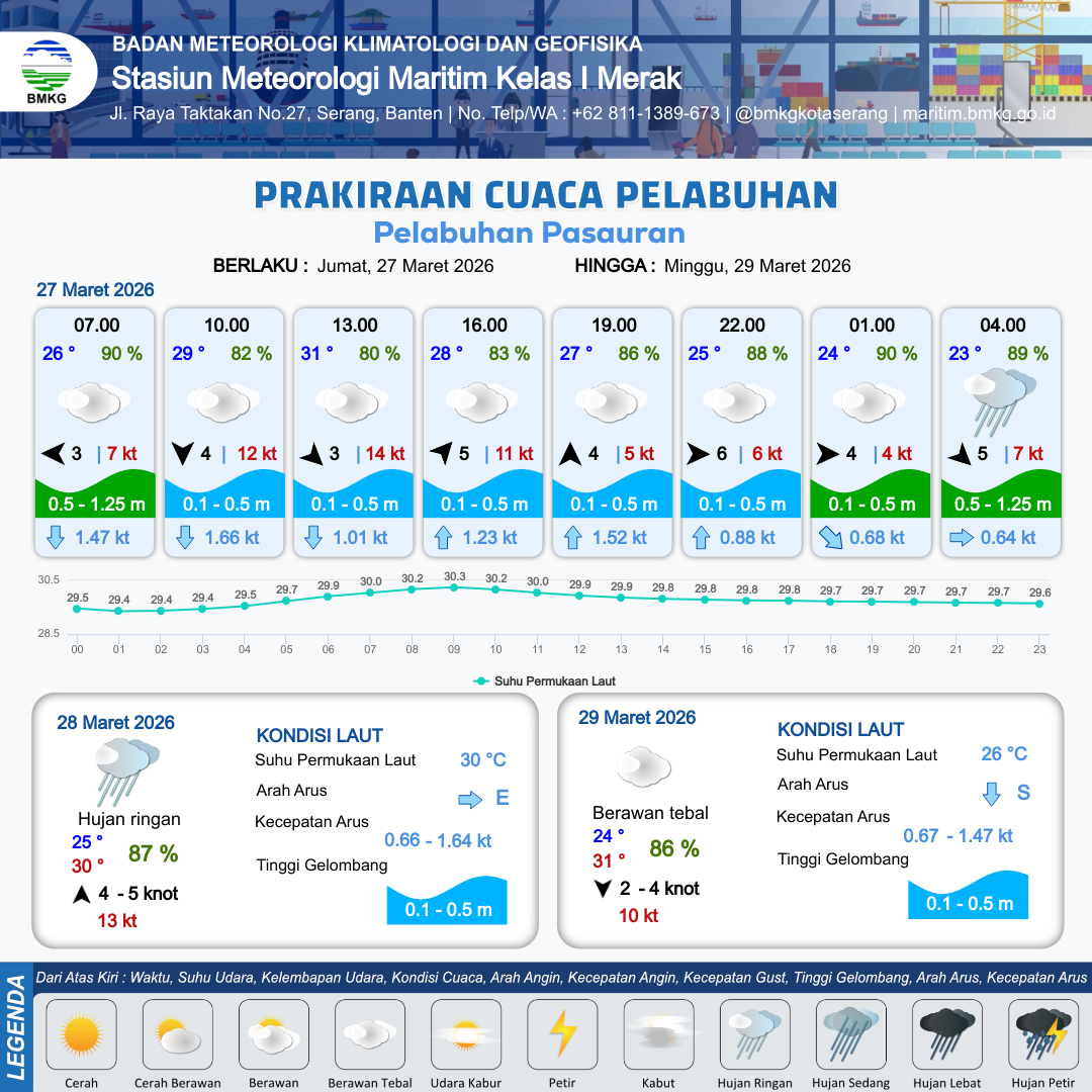27 Mar 26, 07.00 13 jam yang lalu | Berawan Tebal | Barat Laut 3 kt Gust Peningkatan kecepatan angin yang singkat dan tiba-tiba : 12 kt | | | 10 km | 30 °C | 79 % | +0.31 m |