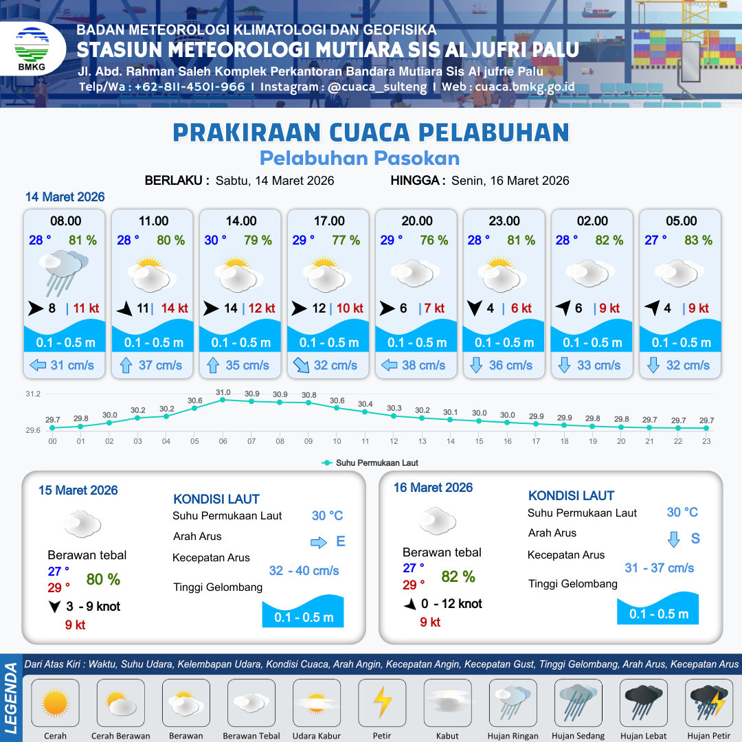 14 Mar 26, 07.00 12 jam yang lalu | Berawan | Barat 14 kt Gust Peningkatan kecepatan angin yang singkat dan tiba-tiba : 11 kt | | | 10 km | 30 °C | 78 % | +0.30 m |