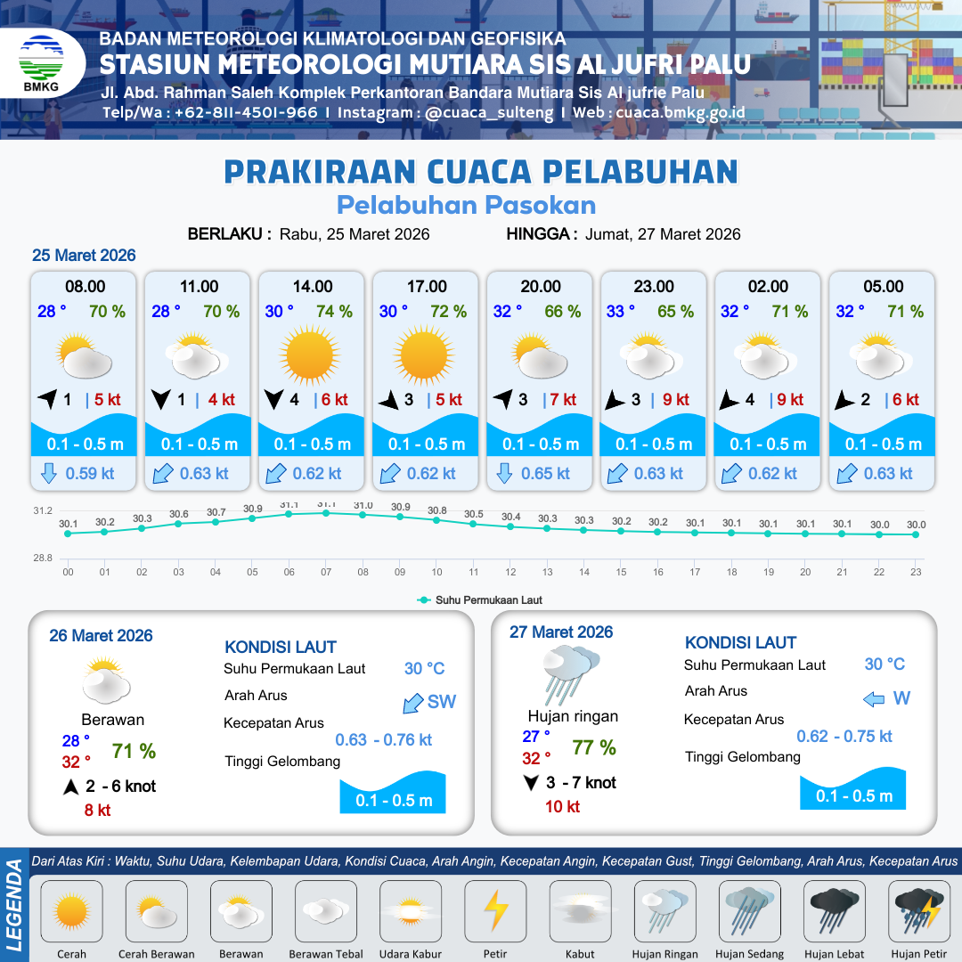 26 Mar 26, 06.00 8 jam kedepan | Timur Laut 7 kt Gust Peningkatan kecepatan angin yang singkat dan tiba-tiba : 9 kt | 0.1 m Tenang | Selatan 0.8 Knot | 10 km | 28 °C | 72 % | -0.08 m | |
