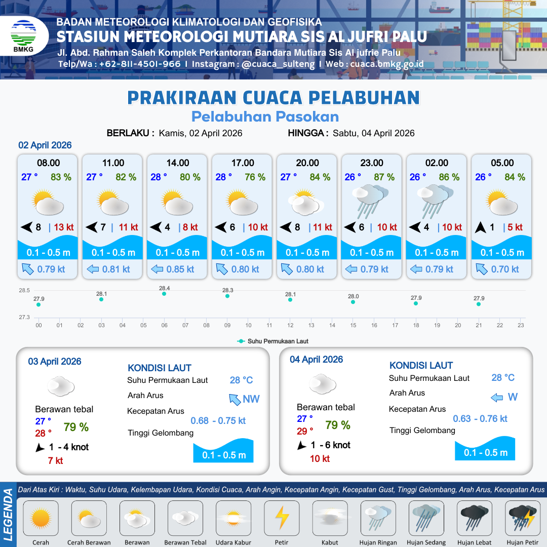 2 Apr 26, 20.00 8 jam kedepan | Selatan 1 kt Gust Peningkatan kecepatan angin yang singkat dan tiba-tiba : 5 kt | 0.3 m Tenang | Barat Laut 0.7 Knot | 9 km | 26 °C | 84 % | +0.65 m | |