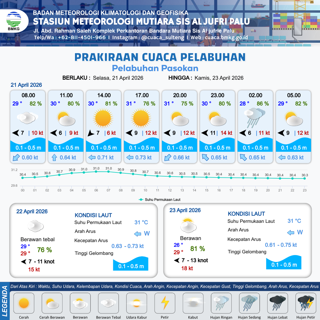 21 Apr 26, 09.00 4 jam kedepan | Timur 9 kt Gust Peningkatan kecepatan angin yang singkat dan tiba-tiba : 12 kt | 0.1 m Tenang | Barat 0.7 Knot | 10 km | 31 °C | 76 % | +0.16 m | |