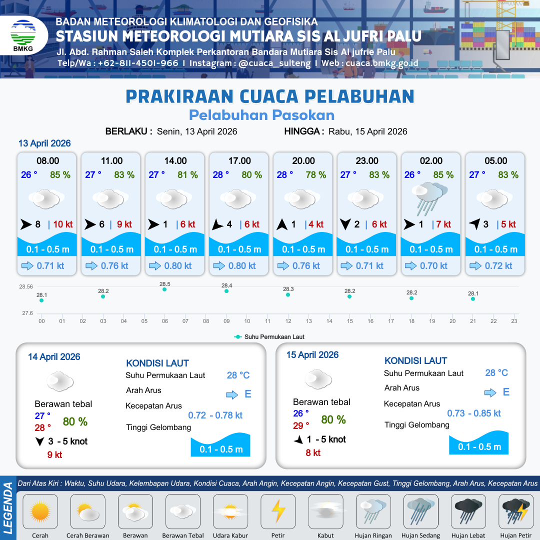 13 Apr 26, 18.00 2 jam kedepan | Barat 1 kt Gust Peningkatan kecepatan angin yang singkat dan tiba-tiba : 7 kt | 0.3 m Tenang | Timur 0.7 Knot | 10 km | 26 °C | 85 % | +0.62 m | |