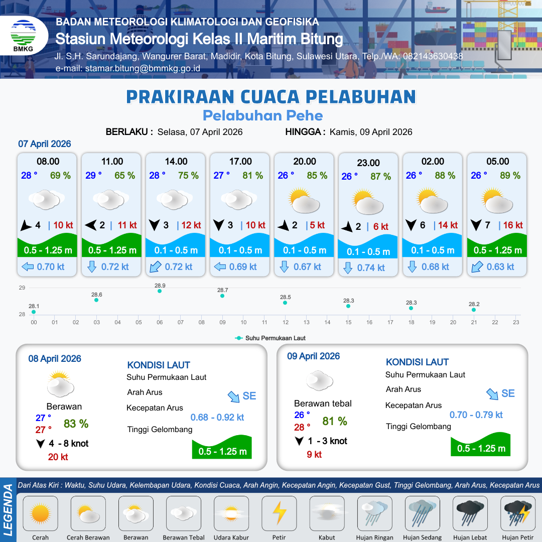 9 Apr 26, 00.00 2 hari 1 jam kedepan | Timur Laut 5 kt Gust Peningkatan kecepatan angin yang singkat dan tiba-tiba : 13 kt | 0.8 m Rendah | Tenggara 0.7 Knot | 10 km | 28 °C | 77 % | +0.63 m |