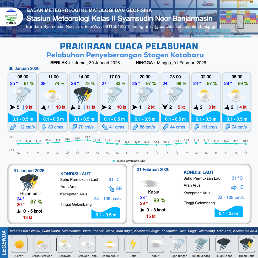 30 Jan 26, 05.00 14 jam yang lalu | Hujan Petir | Timur Laut 2 kt Gust Peningkatan kecepatan angin yang singkat dan tiba-tiba : 9 kt | | | 8 km | 30 °C | 67 % | +0.72 m |