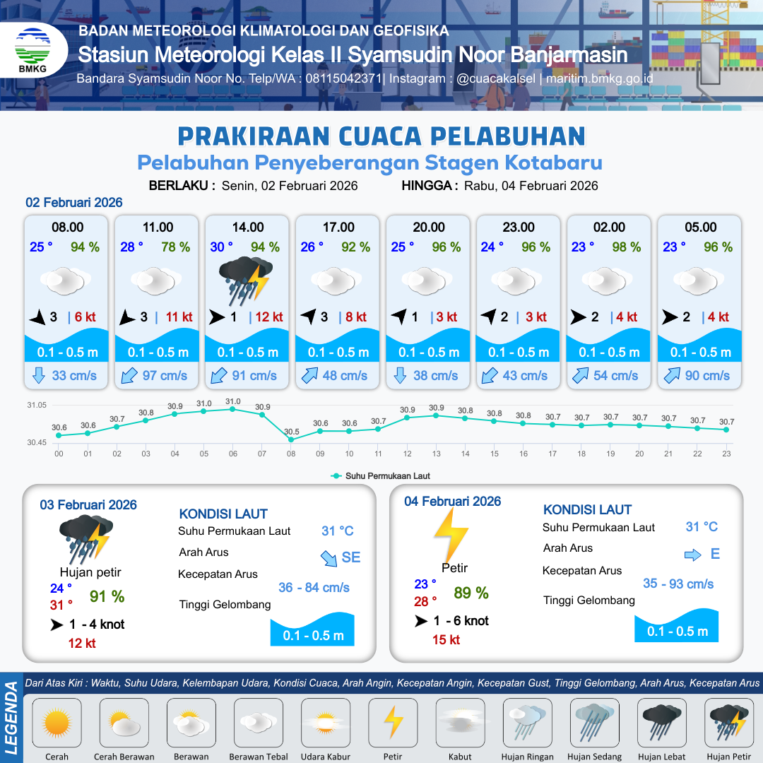 2 Feb 26, 21.00 2 jam kedepan | Berawan Tebal | Barat 2 kt Gust Peningkatan kecepatan angin yang singkat dan tiba-tiba : 4 kt | | | 10 km | 23 °C | 96 % | +0.24 m |