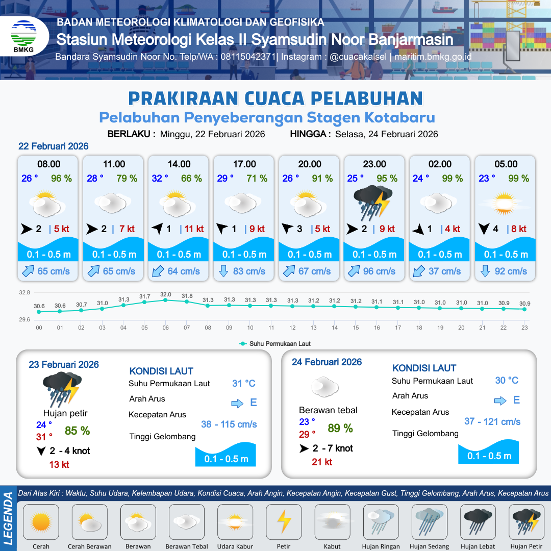 22 Feb 26, 20.00 4 jam kedepan | Utara 4 kt Gust Peningkatan kecepatan angin yang singkat dan tiba-tiba : 8 kt | 0.1 m Tenang | Barat Daya 97.0 cm/s | 2 km | 24 °C | 98 % | -0.23 m | |