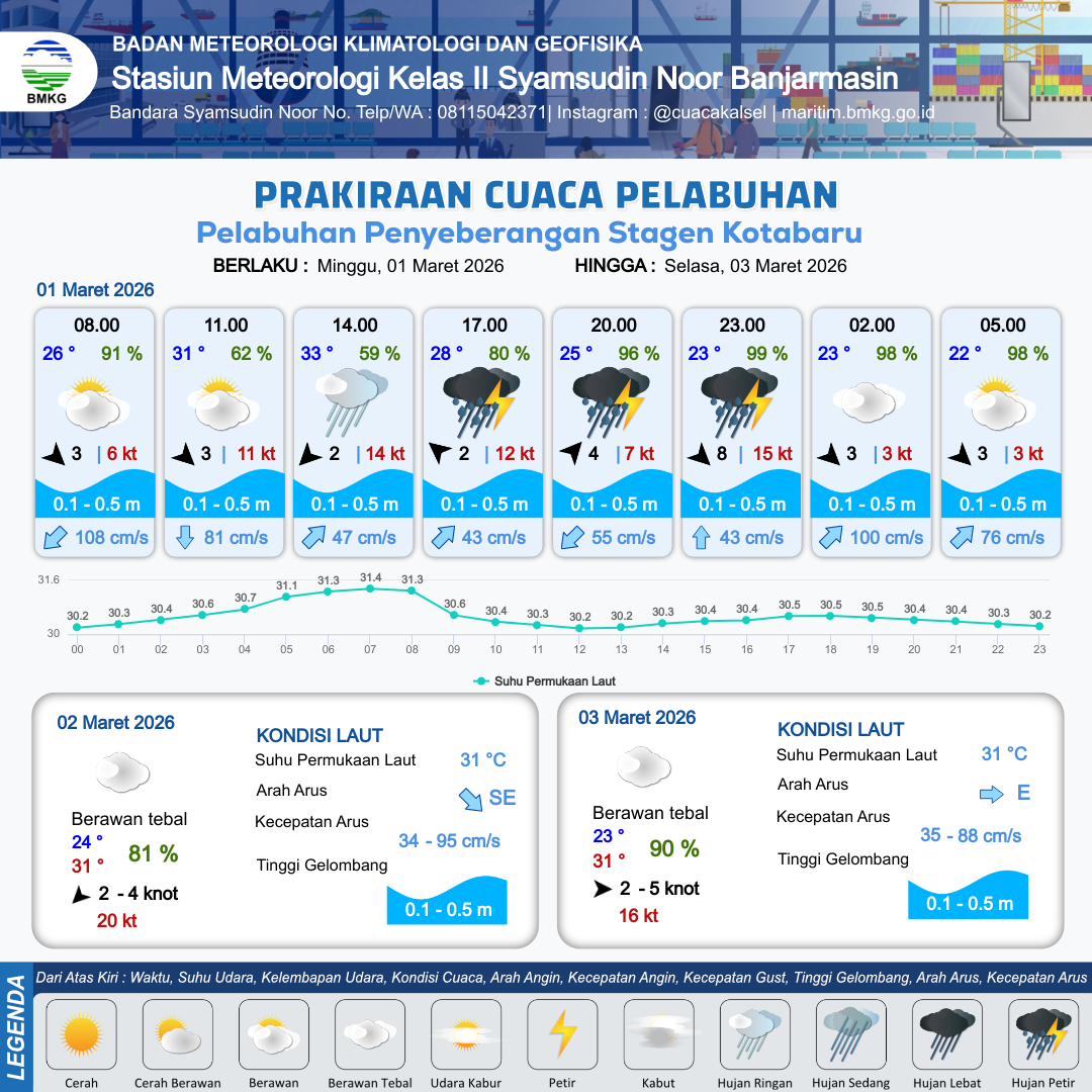 1 Mar 26, 15.00 3 jam yang lalu | Hujan Petir | Barat Laut 8 kt Gust Peningkatan kecepatan angin yang singkat dan tiba-tiba : 15 kt | | | 1 km | 23 °C | 99 % | +0.47 m |