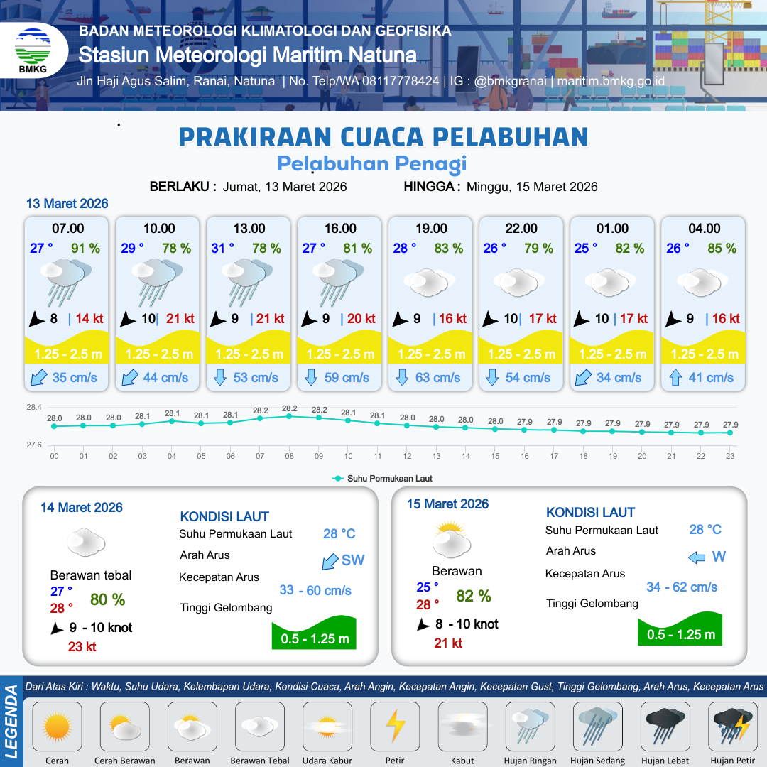 13 Mar 26, 13.00 14 jam kedepan | Timur Laut 9 kt Gust Peningkatan kecepatan angin yang singkat dan tiba-tiba : 17 kt | 1.3 m Sedang | Selatan 64.0 cm/s | 10 km | 27 °C | 81 % | +0.54 m | |
