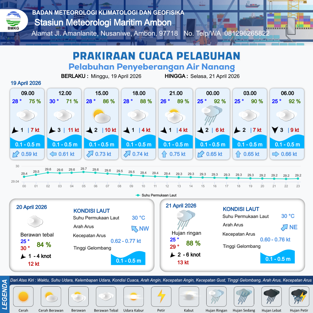 19 Apr 26, 21.00 18 jam kedepan | Utara 3 kt Gust Peningkatan kecepatan angin yang singkat dan tiba-tiba : 9 kt | 0.1 m Tenang | Timur 0.7 Knot | 10 km | 25 °C | 92 % | +0.55 m | |