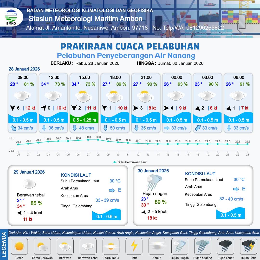 28 Jan 26, 23.00 3 jam kedepan | Berawan Tebal | Barat Laut 1 kt Gust Peningkatan kecepatan angin yang singkat dan tiba-tiba : 7 kt | | | 9 km | 27 °C | 86 % | -0.15 m |