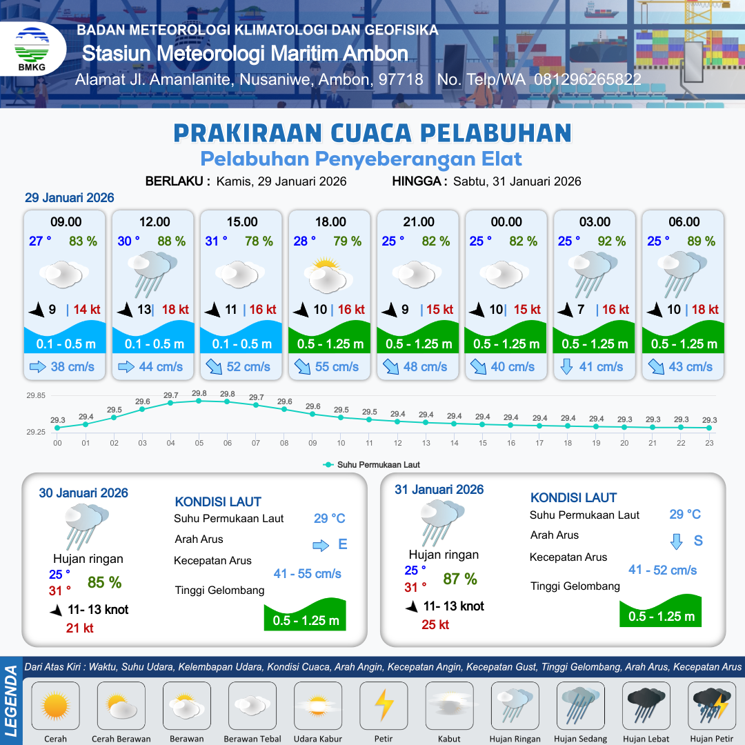 29 Jan 26, 21.00 2 jam kedepan | Hujan Ringan | Barat Laut 10 kt Gust Peningkatan kecepatan angin yang singkat dan tiba-tiba : 18 kt | | | 8 km | 25 °C | 89 % | -1.11 m |