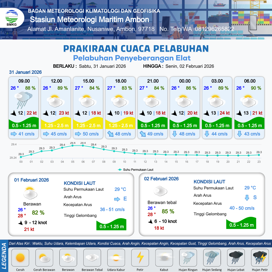 31 Jan 26, 12.00 3 jam kedepan | Barat Laut 10 kt Gust Peningkatan kecepatan angin yang singkat dan tiba-tiba : 18 kt | 1.2 m Rendah | Tenggara 49.0 cm/s | 10 km | 27 °C | 84 % | +0.12 m | |