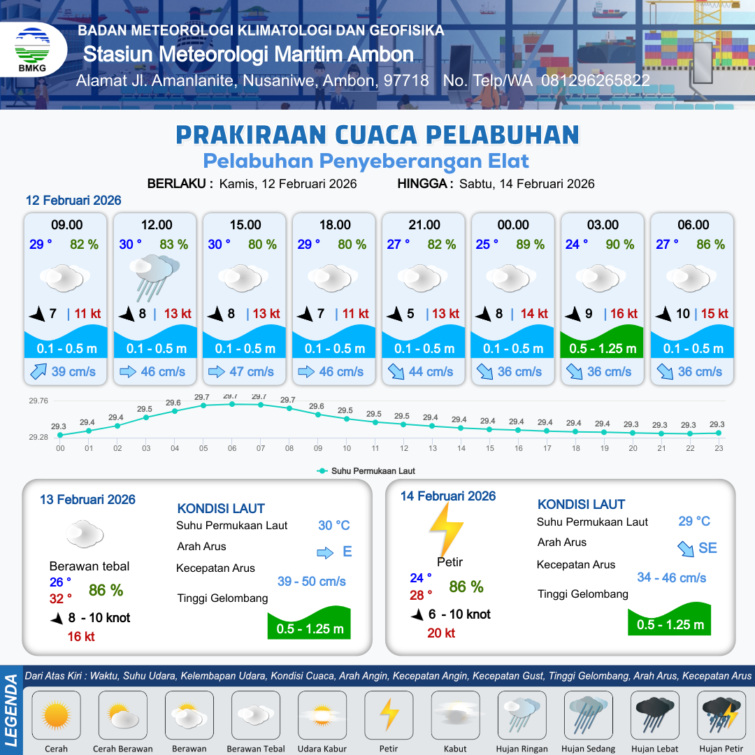 12 Feb 26, 07.00 6 jam kedepan | Barat Laut 8 kt Gust Peningkatan kecepatan angin yang singkat dan tiba-tiba : 14 kt | 0.5 m Rendah | Timur 46.0 cm/s | 10 km | 30 °C | 80 % | -0.04 m | |