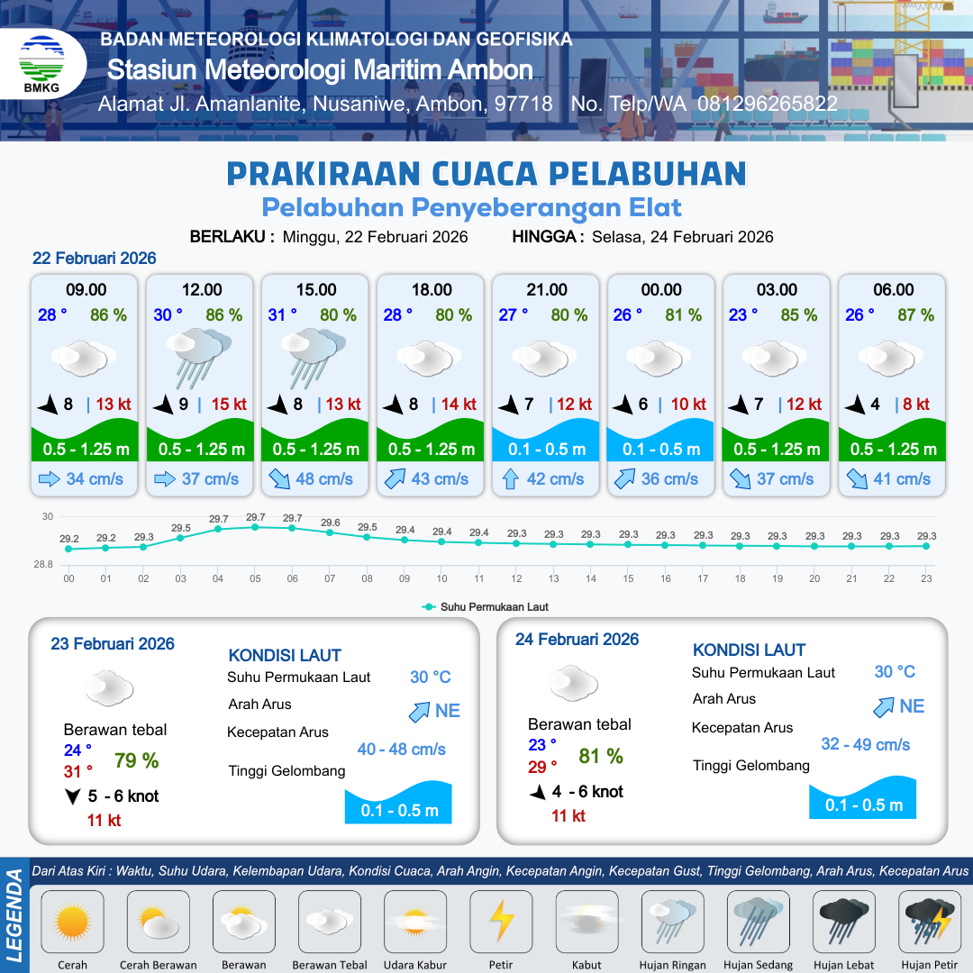 22 Feb 26, 15.00 10 jam kedepan | Barat Laut 9 kt Gust Peningkatan kecepatan angin yang singkat dan tiba-tiba : 12 kt | 0.7 m Rendah | Timur Laut 34.0 cm/s | 10 km | 25 °C | 83 % | -1.11 m | |