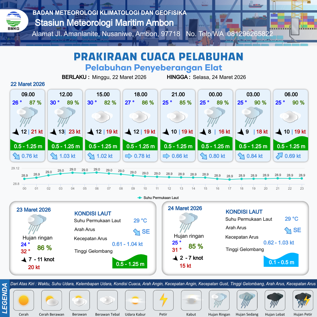 22 Mar 26, 22.00 2 jam kedepan | Berawan Tebal | Barat Laut 10 kt Gust Peningkatan kecepatan angin yang singkat dan tiba-tiba : 20 kt | | | 10 km | 26 °C | 88 % | +0.72 m |