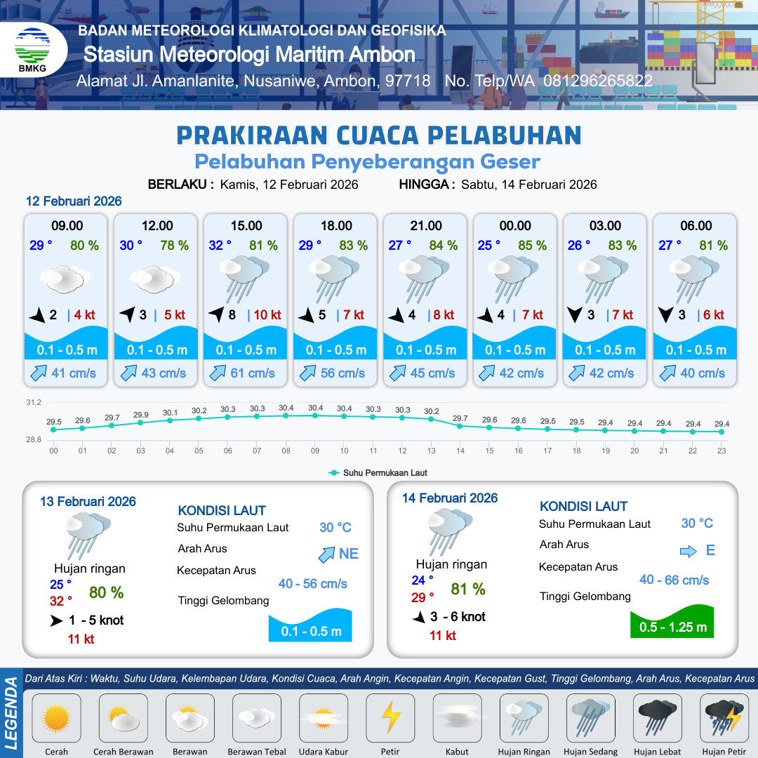 11 Feb 26, 05.00 13 jam yang lalu | Berawan Tebal | Barat Laut 2 kt Gust Peningkatan kecepatan angin yang singkat dan tiba-tiba : 8 kt | | | 10 km | 32 °C | 82 % | -0.19 m |