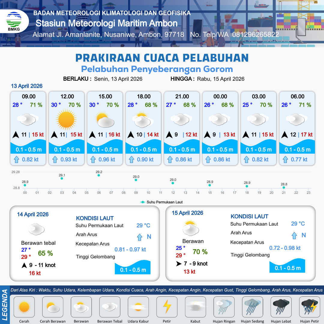 13 Apr 26, 13.00 5 jam kedepan | Selatan 9 kt Gust Peningkatan kecepatan angin yang singkat dan tiba-tiba : 12 kt | 0.3 m Tenang | Utara 0.9 Knot | 10 km | 27 °C | 68 % | +0.66 m | |