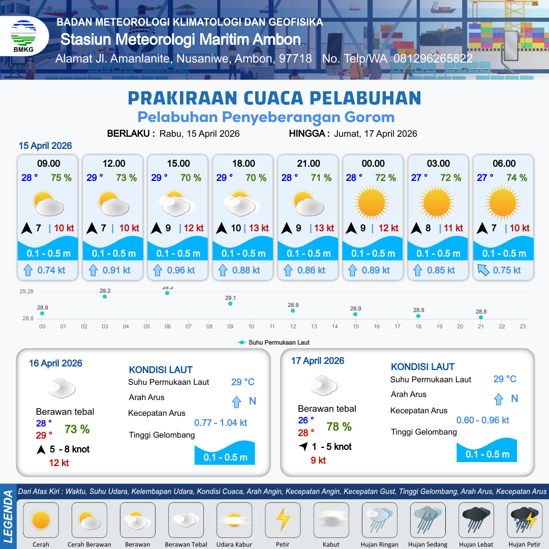 15 Apr 26, 08.00 11 jam yang lalu | Berawan Tebal | Selatan 10 kt Gust Peningkatan kecepatan angin yang singkat dan tiba-tiba : 13 kt | | | 10 km | 29 °C | 70 % | +0.62 m |