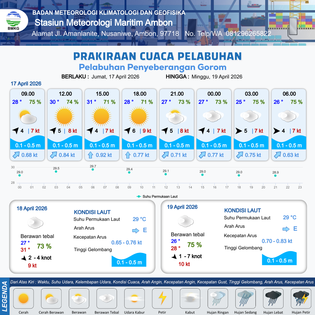 16 Apr 26, 23.00 3 jam kedepan | Berawan Tebal | Barat Daya 5 kt Gust Peningkatan kecepatan angin yang singkat dan tiba-tiba : 8 kt | | | 10 km | 28 °C | 77 % | +0.65 m |