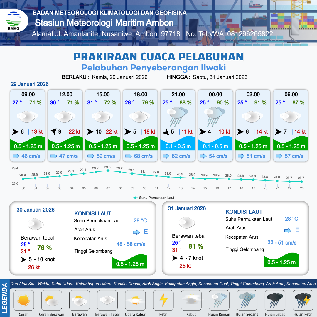29 Jan 26, 20.00 3 jam kedepan | Berawan Tebal | Barat 7 kt Gust Peningkatan kecepatan angin yang singkat dan tiba-tiba : 13 kt | | | 10 km | 25 °C | 89 % | -1.02 m |