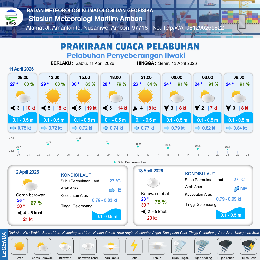 11 Apr 26, 23.00 4 jam kedepan | Cerah | Timur 5 kt Gust Peningkatan kecepatan angin yang singkat dan tiba-tiba : 11 kt | | | 10 km | 26 °C | 84 % | +0.54 m |