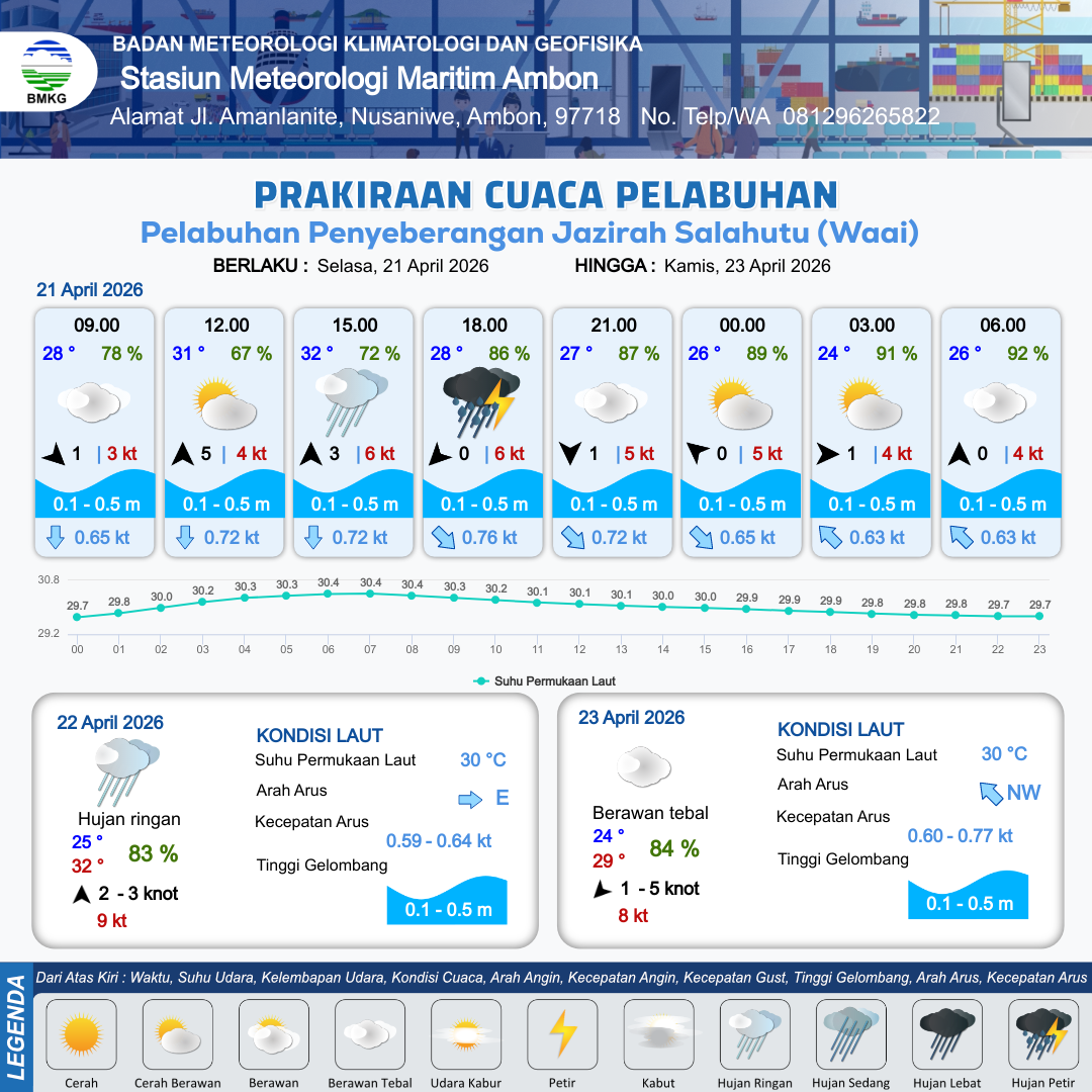 21 Apr 26, 07.00 3 jam kedepan | Barat Laut 3 kt Gust Peningkatan kecepatan angin yang singkat dan tiba-tiba : 5 kt | 0.1 m Tenang | Selatan 0.7 Knot | 10 km | 31 °C | 77 % | +1.02 m | |