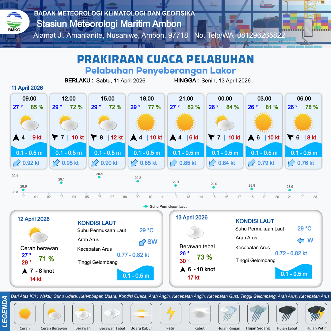 11 Apr 26, 23.00 2 jam kedepan | Cerah | Tenggara 7 kt Gust Peningkatan kecepatan angin yang singkat dan tiba-tiba : 9 kt | | | 10 km | 28 °C | 75 % | +0.66 m |