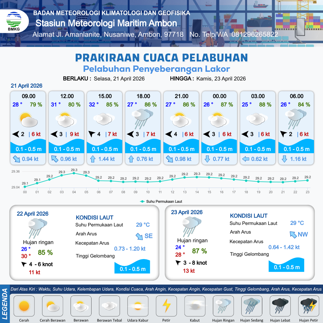 21 Apr 26, 03.00 14 jam kedepan | Tenggara 3 kt Gust Peningkatan kecepatan angin yang singkat dan tiba-tiba : 9 kt | 0.1 m Tenang | Barat Laut 1.1 Knot | 10 km | 30 °C | 77 % | -0.25 m | |