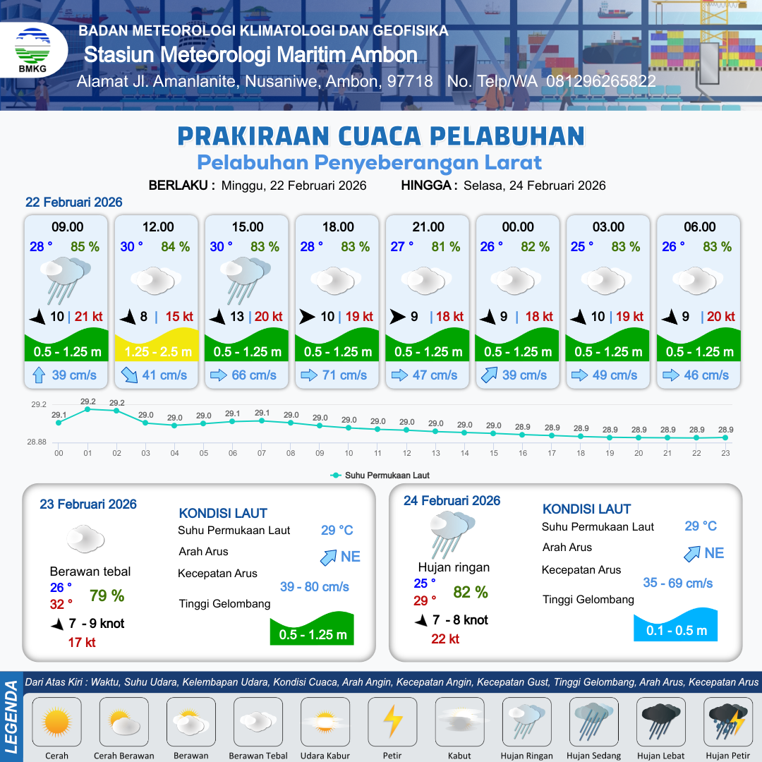22 Feb 26, 18.00 2 jam kedepan | Barat 9 kt Gust Peningkatan kecepatan angin yang singkat dan tiba-tiba : 18 kt | 1.1 m Rendah | Timur 45.0 cm/s | 10 km | 24 °C | 86 % | -0.03 m | |