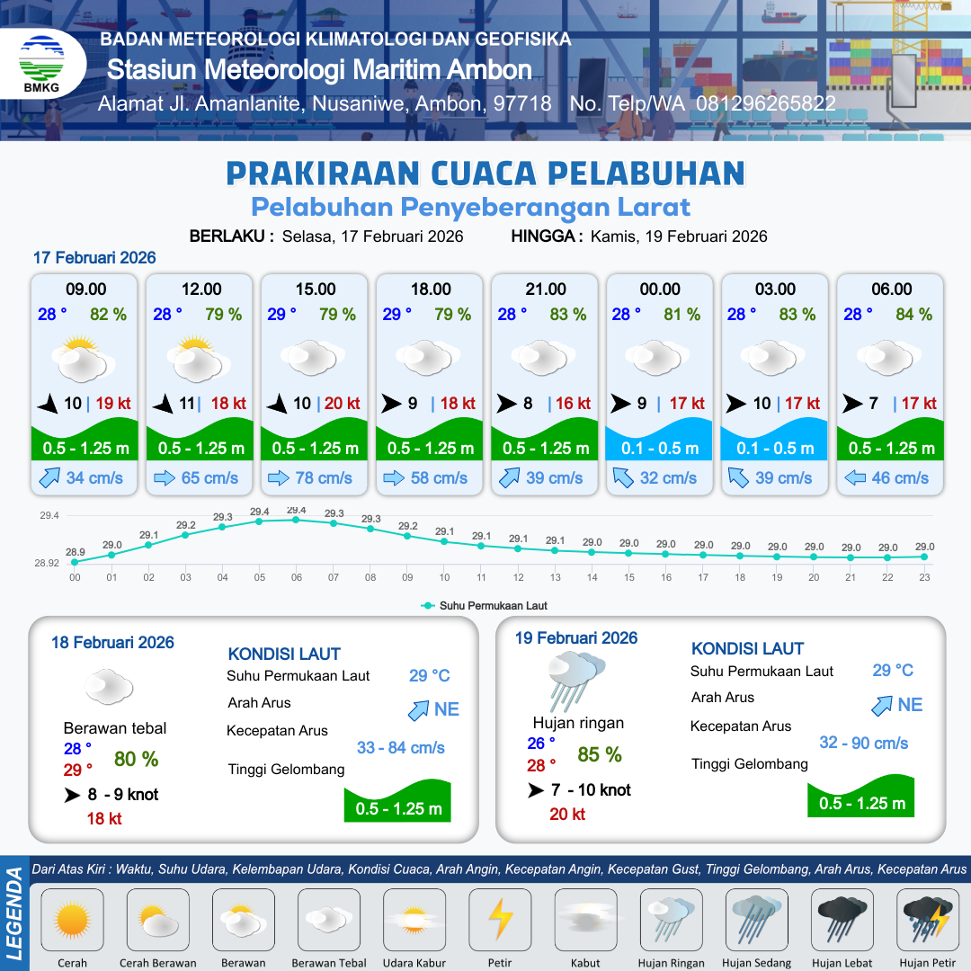 17 Feb 26, 23.00 3 jam kedepan | Berawan Tebal | Barat 9 kt Gust Peningkatan kecepatan angin yang singkat dan tiba-tiba : 14 kt | | | 10 km | 28 °C | 82 % | -1.04 m |
