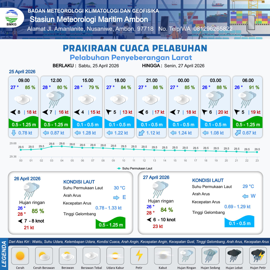 24 Apr 26, 13.00 11 jam kedepan | Tenggara 6 kt Gust Peningkatan kecepatan angin yang singkat dan tiba-tiba : 15 kt | 0.5 m Rendah | Barat 1.1 Knot | 5 km | 27 °C | 88 % | -0.01 m | |