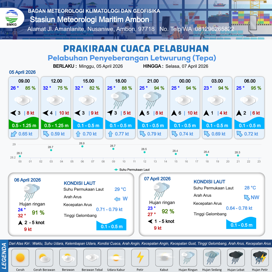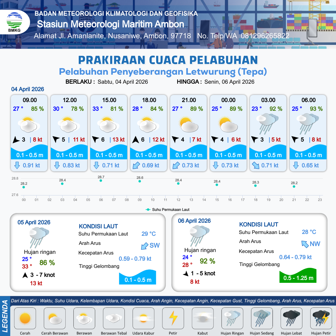 4 Apr 26, 10.00 8 jam yang lalu | Cerah Berawan | Selatan 6 kt Gust Peningkatan kecepatan angin yang singkat dan tiba-tiba : 9 kt | | | 10 km | 27 °C | 89 % | +0.66 m |