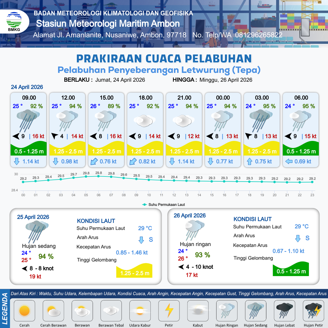 23 Apr 26, 12.00 24 jam kedepan | Tenggara 5 kt Gust Peningkatan kecepatan angin yang singkat dan tiba-tiba : 7 kt | 1.2 m Rendah | Selatan 1.0 Knot | 9 km | 25 °C | 94 % | -0.08 m | |