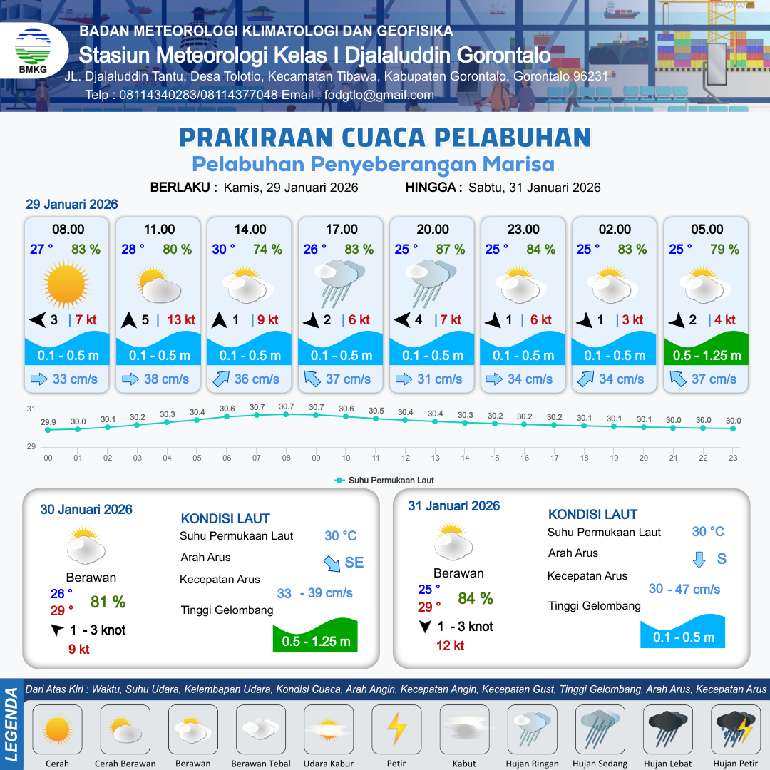 29 Jan 26, 23.00 10 jam kedepan | Tenggara 1 kt Gust Peningkatan kecepatan angin yang singkat dan tiba-tiba : 4 kt | 0.6 m Rendah | Barat 38.0 cm/s | 10 km | 26 °C | 77 % | -0.16 m |