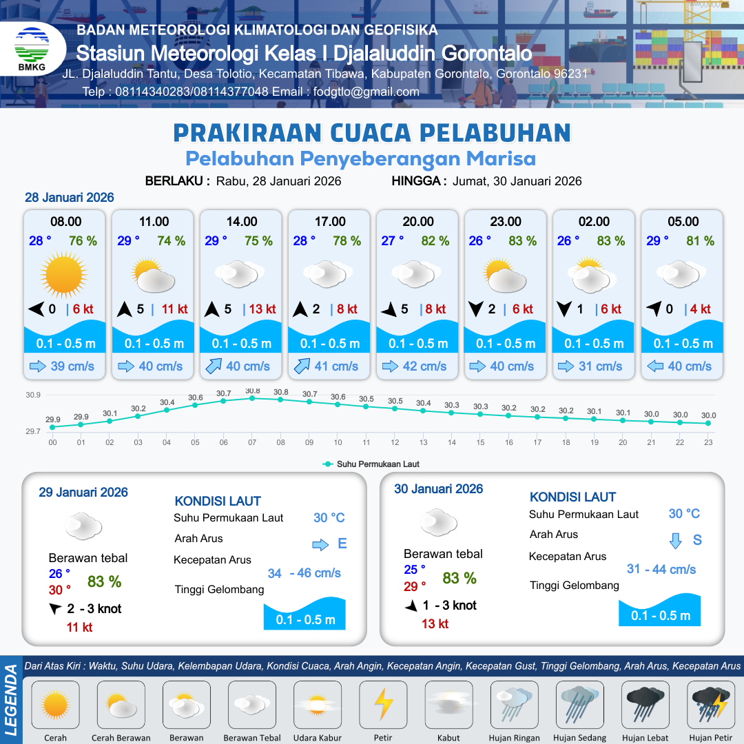 28 Jan 26, 23.00 12 jam kedepan | Tenggara 2 kt Gust Peningkatan kecepatan angin yang singkat dan tiba-tiba : 3 kt | 0.1 m Tenang | Barat Daya 33.0 cm/s | 10 km | 27 °C | 80 % | -0.04 m |
