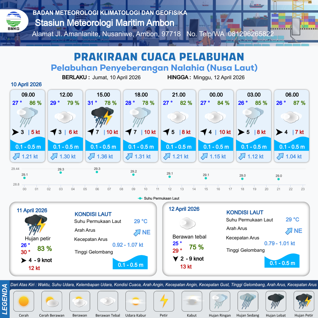 10 Apr 26, 06.00 15 jam yang lalu | Hujan Petir | Barat Daya 7 kt Gust Peningkatan kecepatan angin yang singkat dan tiba-tiba : 10 kt | | | 7 km | 31 °C | 78 % | +0.71 m |