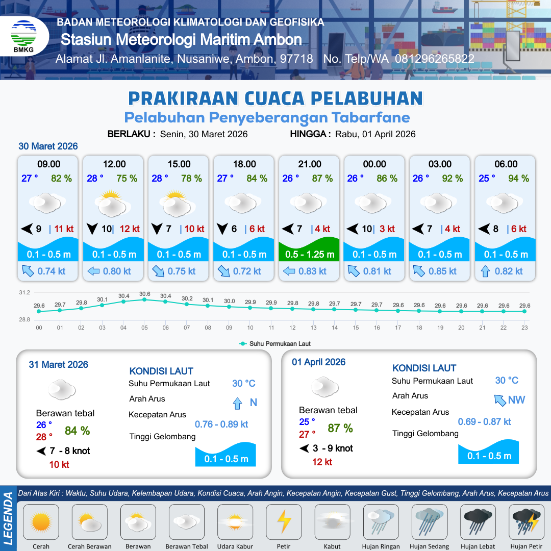 30 Mar 26, 14.00 2 jam kedepan | Timur 10 kt Gust Peningkatan kecepatan angin yang singkat dan tiba-tiba : 3 kt | 0.5 m Rendah | Barat 0.8 Knot | 10 km | 27 °C | 85 % | +0.50 m | |