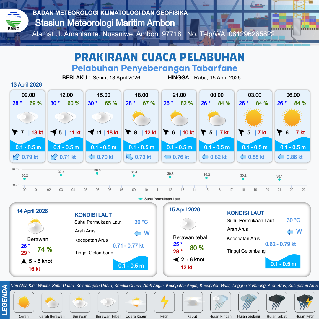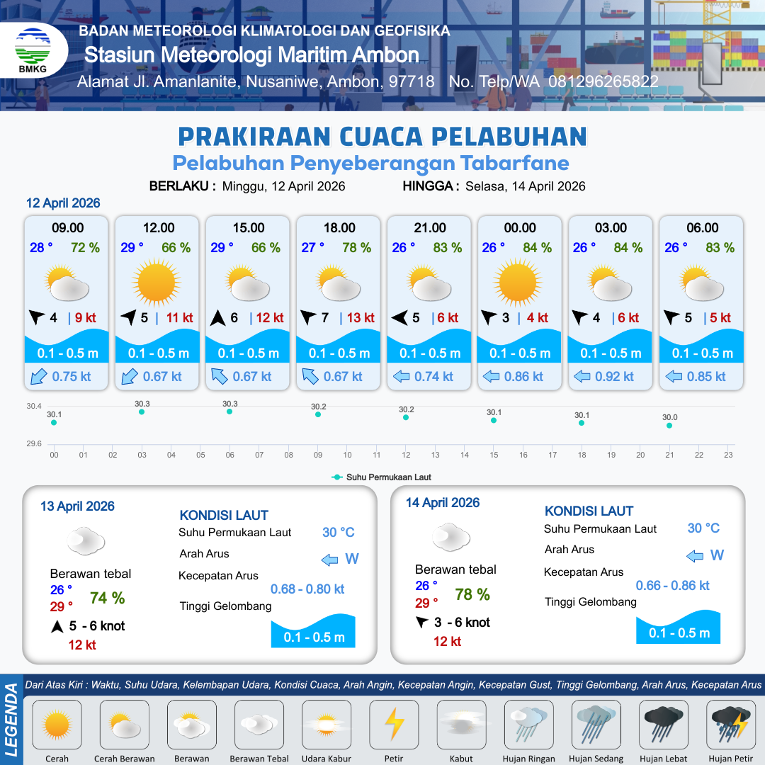 12 Apr 26, 09.00 9 jam kedepan | Tenggara 7 kt Gust Peningkatan kecepatan angin yang singkat dan tiba-tiba : 13 kt | 0.3 m Tenang | Barat Laut 0.7 Knot | 10 km | 27 °C | 78 % | +0.69 m | |