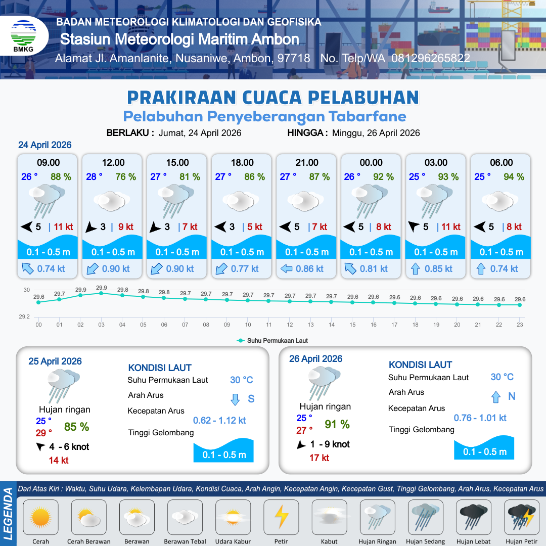 24 Apr 26, 15.00 18 jam kedepan | Tenggara 4 kt Gust Peningkatan kecepatan angin yang singkat dan tiba-tiba : 8 kt | 0.2 m Tenang | Barat Laut 0.8 Knot | 10 km | 25 °C | 92 % | -0.85 m | |