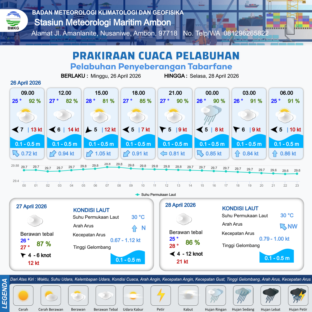 26 Apr 26, 17.00 18 jam kedepan | Tenggara 6 kt Gust Peningkatan kecepatan angin yang singkat dan tiba-tiba : 9 kt | 0.2 m Tenang | Barat Laut 0.8 Knot | 10 km | 26 °C | 90 % | -0.40 m | |