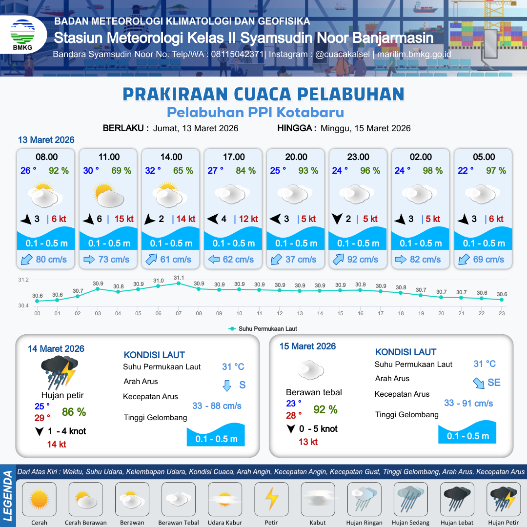 12 Mar 26, 04.00 15 jam yang lalu | Hujan Ringan | Barat 9 kt Gust Peningkatan kecepatan angin yang singkat dan tiba-tiba : 23 kt | | | 10 km | 31 °C | 64 % | +0.17 m |