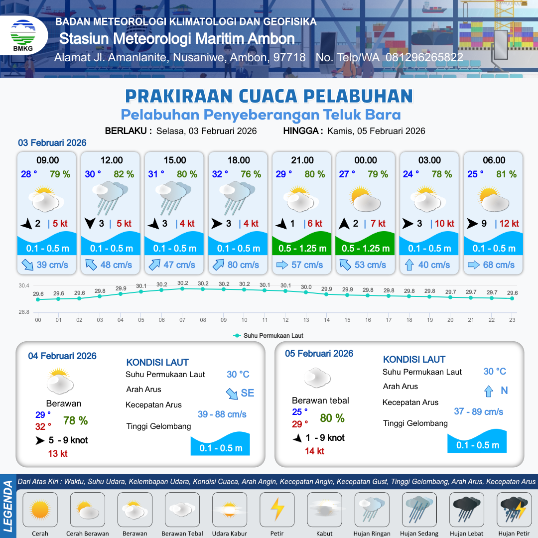 3 Feb 26, 08.00 8 jam kedepan | Barat 3 kt Gust Peningkatan kecepatan angin yang singkat dan tiba-tiba : 4 kt | 0.5 m Rendah | Timur Laut 70.0 cm/s | 8 km | 32 °C | 77 % | +0.61 m | |