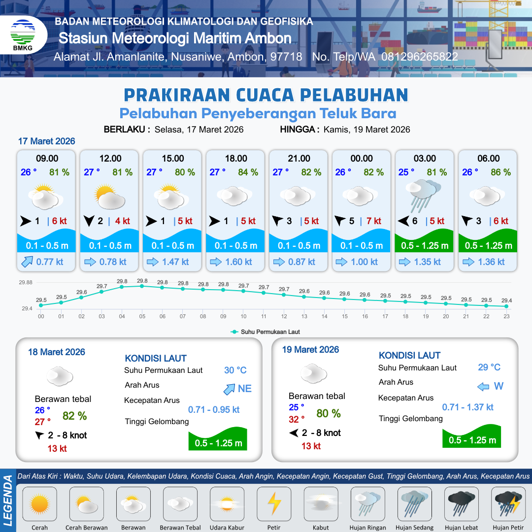 17 Mar 26, 09.00 8 jam kedepan | Barat 1 kt Gust Peningkatan kecepatan angin yang singkat dan tiba-tiba : 5 kt | 0.5 m Rendah | Timur 1.6 Knot | 10 km | 27 °C | 84 % | +0.01 m | |