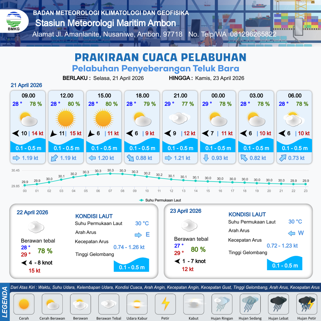 21 Apr 26, 21.00 1 hari 12 jam kedepan | Timur 7 kt Gust Peningkatan kecepatan angin yang singkat dan tiba-tiba : 11 kt | 0.2 m Tenang | Timur Laut 0.8 Knot | 10 km | 27 °C | 83 % | +0.70 m | |