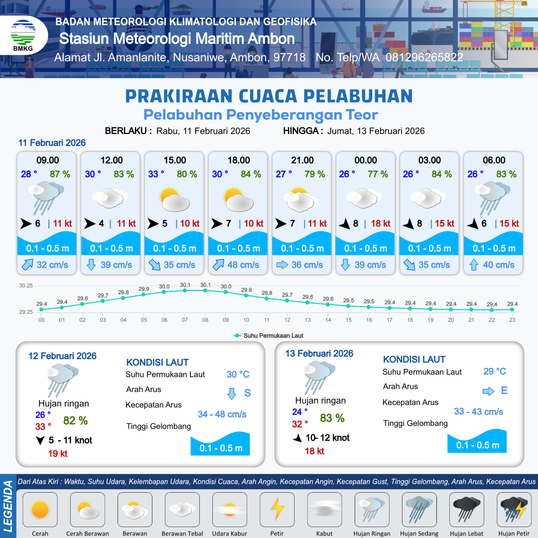 11 Feb 26, 07.00 2 jam kedepan | Barat 5 kt Gust Peningkatan kecepatan angin yang singkat dan tiba-tiba : 11 kt | 0.1 m Tenang | Timur Laut 37.0 cm/s | 10 km | 32 °C | 80 % | -0.02 m | |