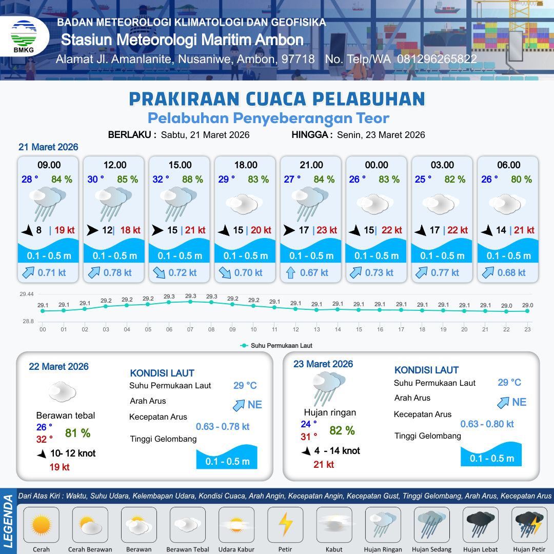 21 Mar 26, 07.00 4 jam kedepan | Barat 15 kt Gust Peningkatan kecepatan angin yang singkat dan tiba-tiba : 20 kt | 0.2 m Tenang | Tenggara 0.7 Knot | 10 km | 31 °C | 84 % | +1.15 m | |