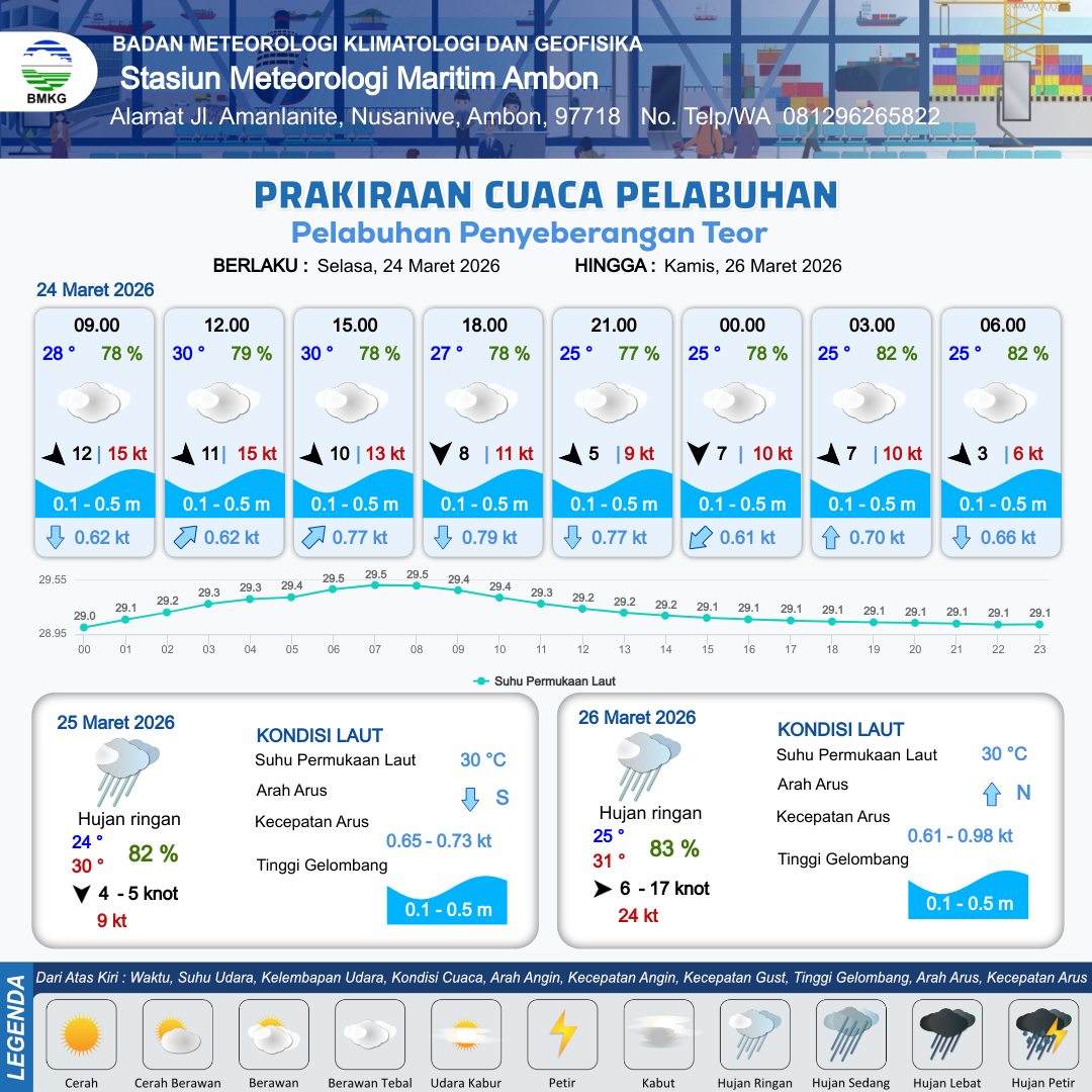 24 Mar 26, 15.00 5 jam kedepan | Utara 7 kt Gust Peningkatan kecepatan angin yang singkat dan tiba-tiba : 10 kt | 0.2 m Tenang | Barat Daya 0.6 Knot | 10 km | 25 °C | 78 % | -1.26 m | |